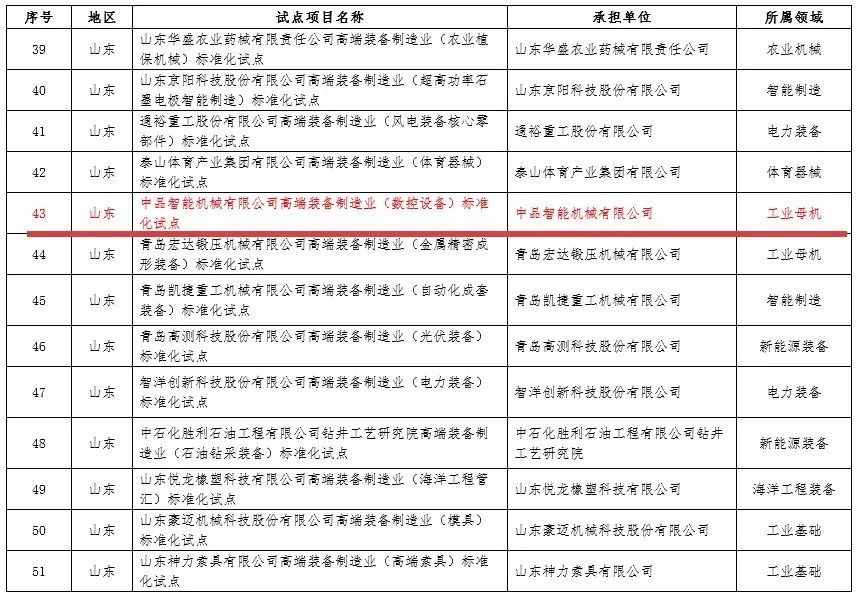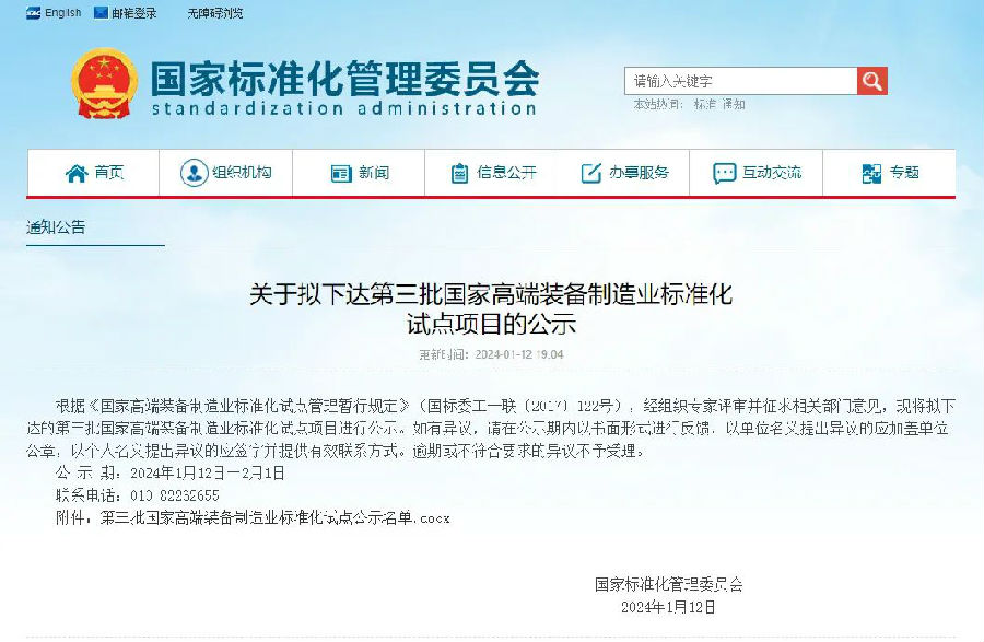 2024年1月12日,國家標(biāo)準(zhǔn)化管理委員會公布了第三批國家高端裝備制造業(yè)標(biāo)準(zhǔn)化試點項目,中品智能機械有限公司入選。